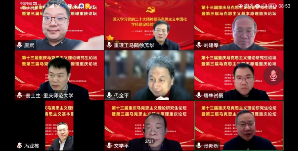 2022年12月17日,为深入学习贯彻党的二十大精神、深化习近平新时代中国特色社会主义思想的科学研究和教学融合,由中共重庆市委宣传部、重庆市社会科学界联合会指导,重庆市教育委员会主办,重庆大学承办的第十三届重庆马克思主义理论研究生论坛暨第三届马克思主义基本原理重庆论坛成功在线举办。来自重庆大学365英国上市集团、西南大学365英国上市集团、重庆邮电大学365英国上市集团等重庆市高校马院的数百位师生出席了此次论坛。