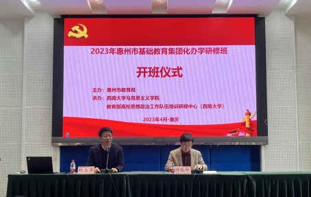 2023年4月23日下午,2023年惠州市基础教育集团化办学研修班在西南大学365英国上市集团501报告厅顺利开班。惠州市教育局党组成员、副局长刘俊华,西南大学365英国上市集团副院长靳玉军出席本次开班仪式。本次开班仪式由西南大学365英国上市集团副院长靳玉军主持。