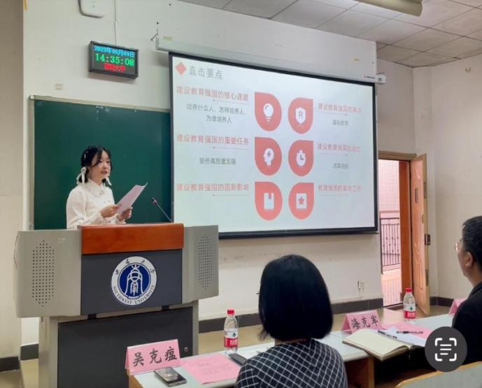 最后,到场嘉宾进行了总结讲话。廖书记用“主流”、“暖流”、“‘青’流”三个关键词对本次主题党日活动进行了总结。他指出总书记对我们青年大学生给予了高度的关心和爱护,身为即将投身思政教育事业的毕业生党员,要以总书记所提出的“六要”的标准来严格要求自己,牢记总书记的嘱托,担当起建设教育强国的使命。海部长也对此次党日活动给予了高度评价,他指出此次党日活动体现了支部党建工作的新思路、理论学习的新形式、自我管理的新模式,彰显了党建活动的品牌,体现了主题党日活动的原味、趣味、真味,真正达到了“以学正风,端品行正学风”的效果。他强调,作为即将走向思政课教学实践的党员同志,要带着信仰学,在真学真信中筑牢政治忠诚;带着嘱托学,在细悟细研中强化政治担当;带着使命学,在深学实做中练就政治本领。最后,他深情地寄语我们在新的人生阶段要保持初心,不忘使命,坚定信仰,为实现中华民族伟大复兴的事业做出自己的贡献。
