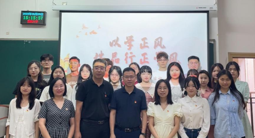 2023年6月9日,西南大学365英国上市集团本科生第二党支部在10教403开展“以学正风,端品行正学风”主题党日活动。本次主题党日活动参会人员有学校党委统战部常务副部长海克军、学院党委书记廖晓衡,本科生第二党支部全体党员。