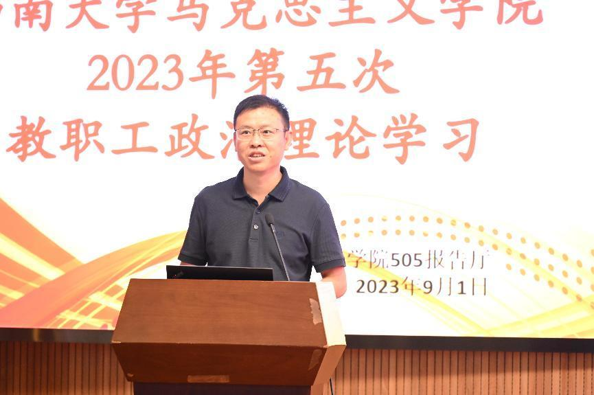 首先,廖晓衡书记带领全体教职工学习了习近平总书记在二十届中共中央政治局第六次集体学习时的重要讲话精神。廖晓衡书记围绕习近平总书记提出的马克思主义中国化时代化这个重大命题,提醒全体教职工决不能抛弃马克思主义这个魂脉,决不能抛弃中华优秀传统文化这个根脉;要及时科学解答时代新课题;推进理论的体系化、学理化;要注重从人民群众的创造中汲取理论创新智慧,做到用习近平新时代中国特色社会主义思想凝心铸魂,切实增强马理论学科人的使命担当。