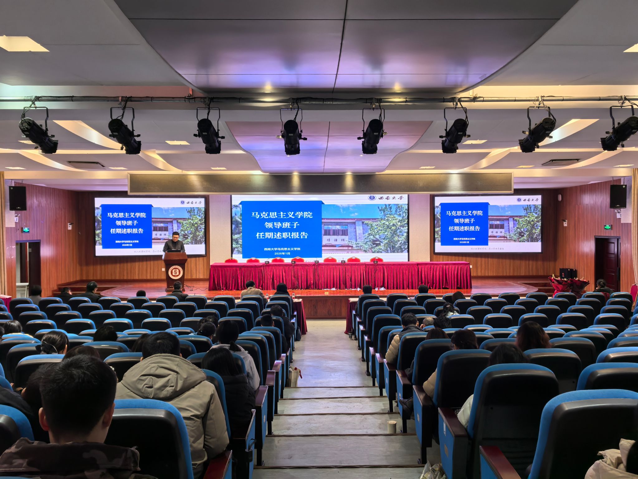 会上,学院党委书记吴文杰先代表领导班子从2020年1月至2024年12月任期主要工作业绩、存在的主要问题和主要原因以及下一步的工作打算三方面进行述职。他指出,班子在开展主题教育、推进党建标杆院系建设以及重点马院建设方面取得显著成绩,同时也指出学院领导班子建设和学院工作中存在的不足以及下一步的工作打算。2025年学院将继续坚持问题导向和目标导向,以学习贯彻党的创新理论为首要政治任务,以深入推进新时代“红岩先锋”变革型组织建设为突破口,全面推进党建与事业发展“一融双高”。