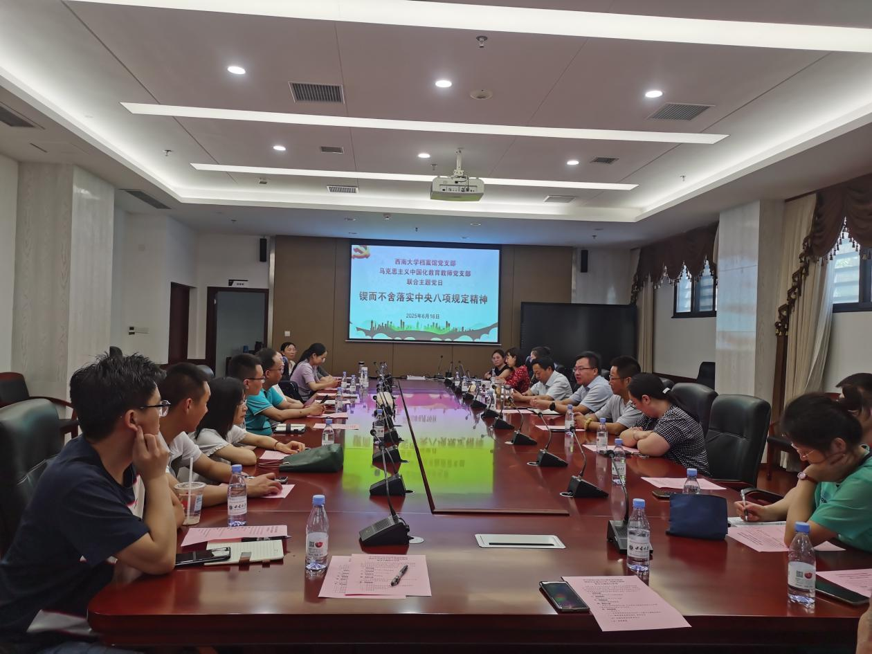 为深入学习习近平总书记关于加强党的作风建设的重要论述,深刻领悟党员基本培训第一次集中大课内容要求,推进支部党建的联动互学,6月16日下午,在西南大学档案馆会议室和西南大学博物馆展厅,马克思主义中国化教育教师党支部与西南大学档案馆党支部联合开展主题党日活动,活动主题是“锲而不舍落实中央八项规定精神”。