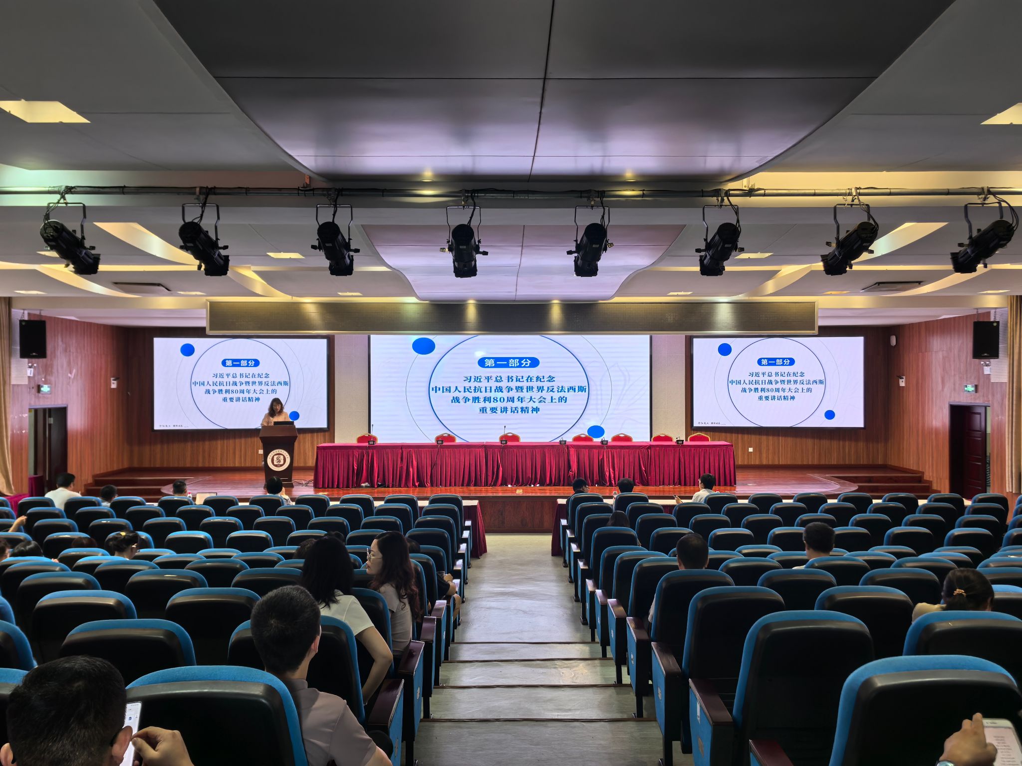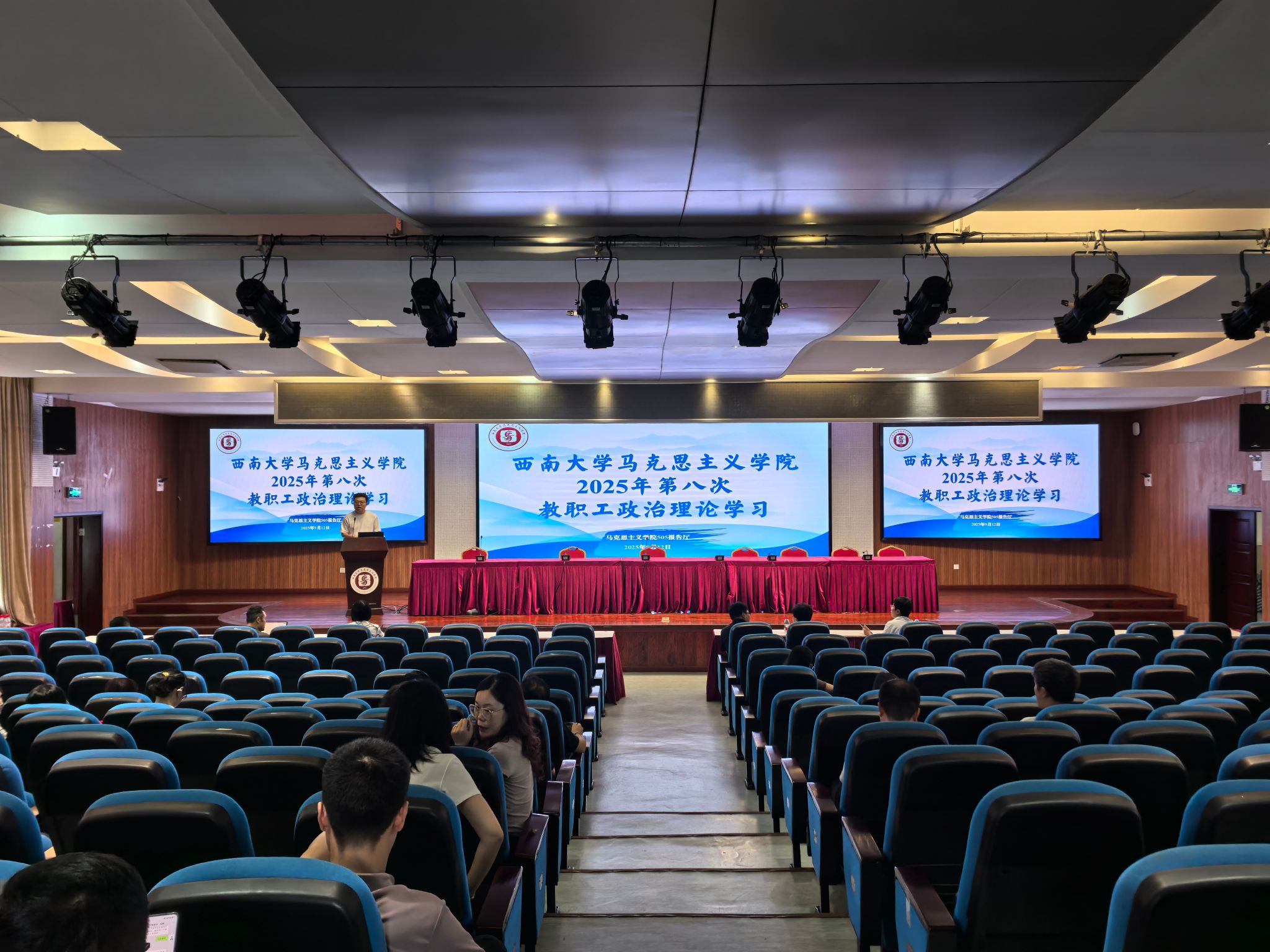 2025912日下午,学院在505报告厅开展2025年第八次教职工政治理论学习,集中学习了习近平总书记在纪念中国人民抗日战争暨世界反法西斯战争胜利80周年大会上的重要讲话精神、《求是》杂志发表的习近平总书记重要文章《弘扬伟大抗战精神,向着中华民族伟大复兴的光辉彼岸奋勇前进》、习近平总书记对深入贯彻中央八项规定精神学习教育作出的重要指示精神2025年秋季学期开学干部大会精神观看了西大教师故事侯光炯老师的短视频。学院全体教职工参加,学院党委书记吴文杰主持,本次教职工政治理论学习由学院马克思主义基本原理教育系教师党支部书记邓春芝领学。