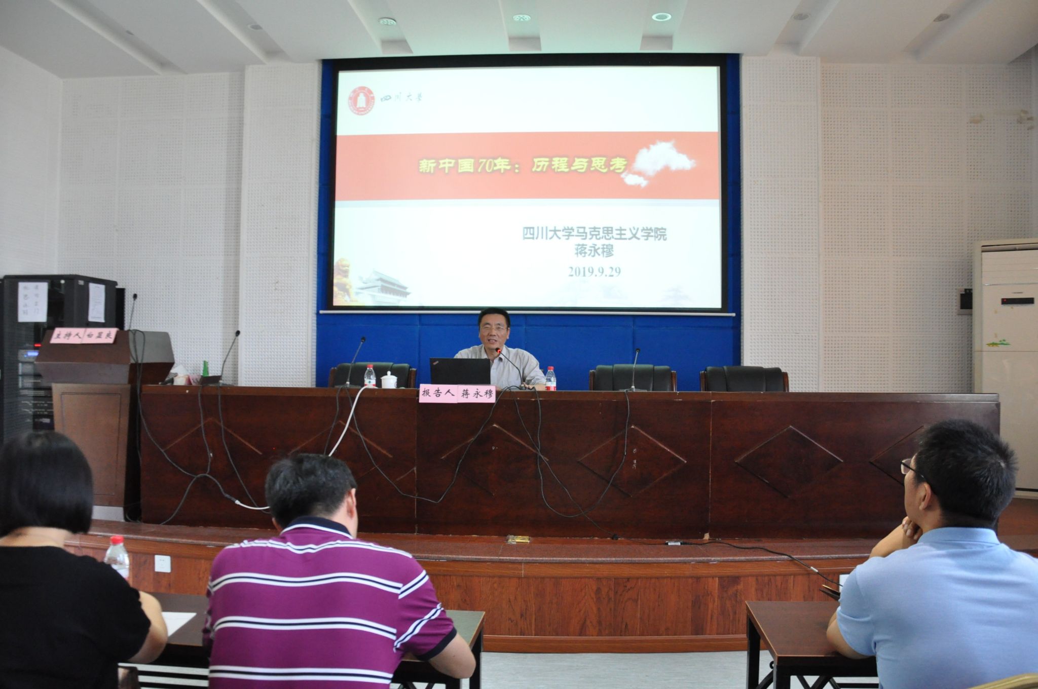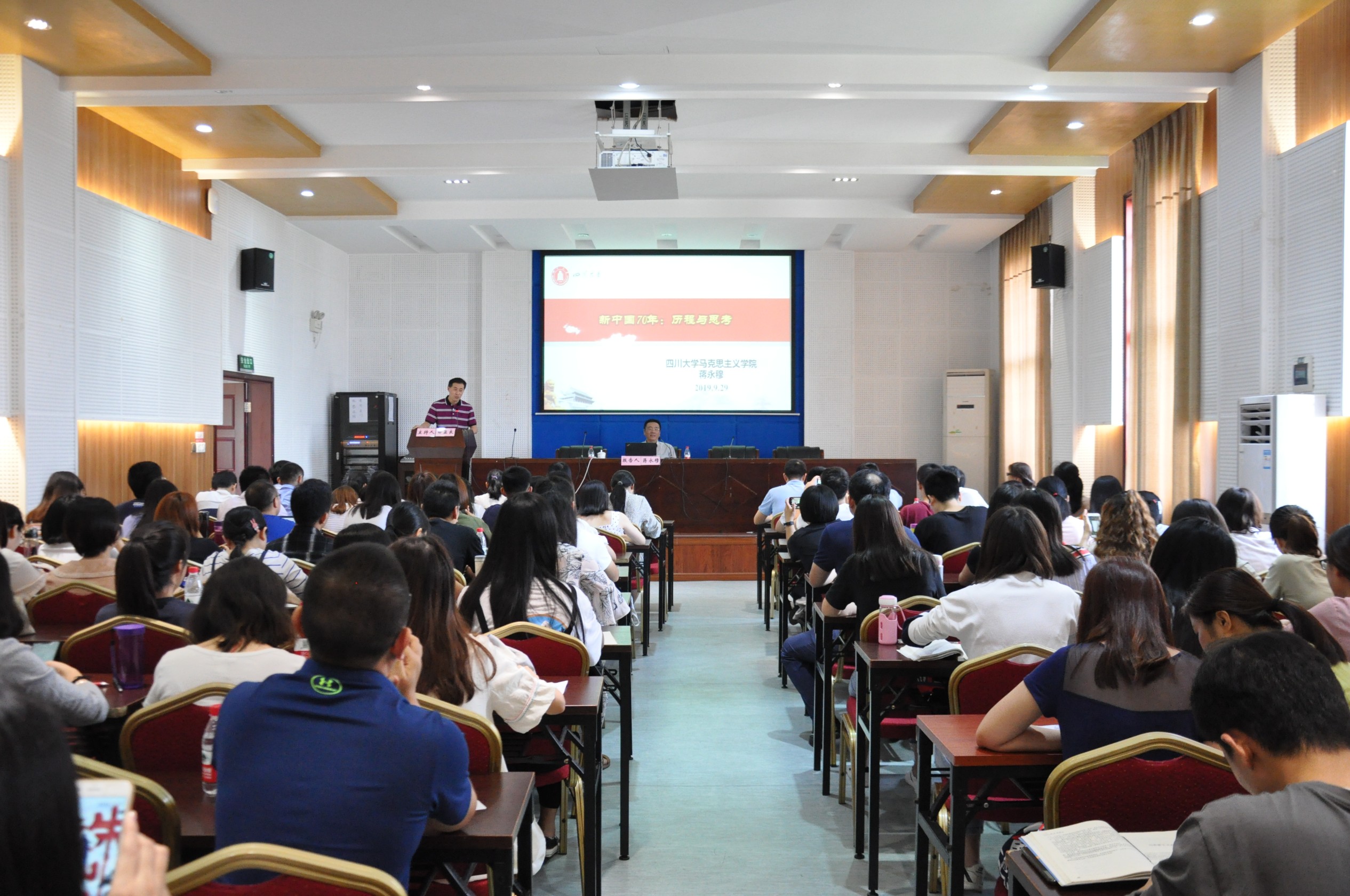 9月29日下午,四川大学蒋永穆教授应邀在学院501报告厅作了题为“新中国70年:历程与思考”的学术报告,报告由我院院长、党委副书记白显良教授主持,学院党委中心组成员、研究生党员代表参加了此次学术报告。
