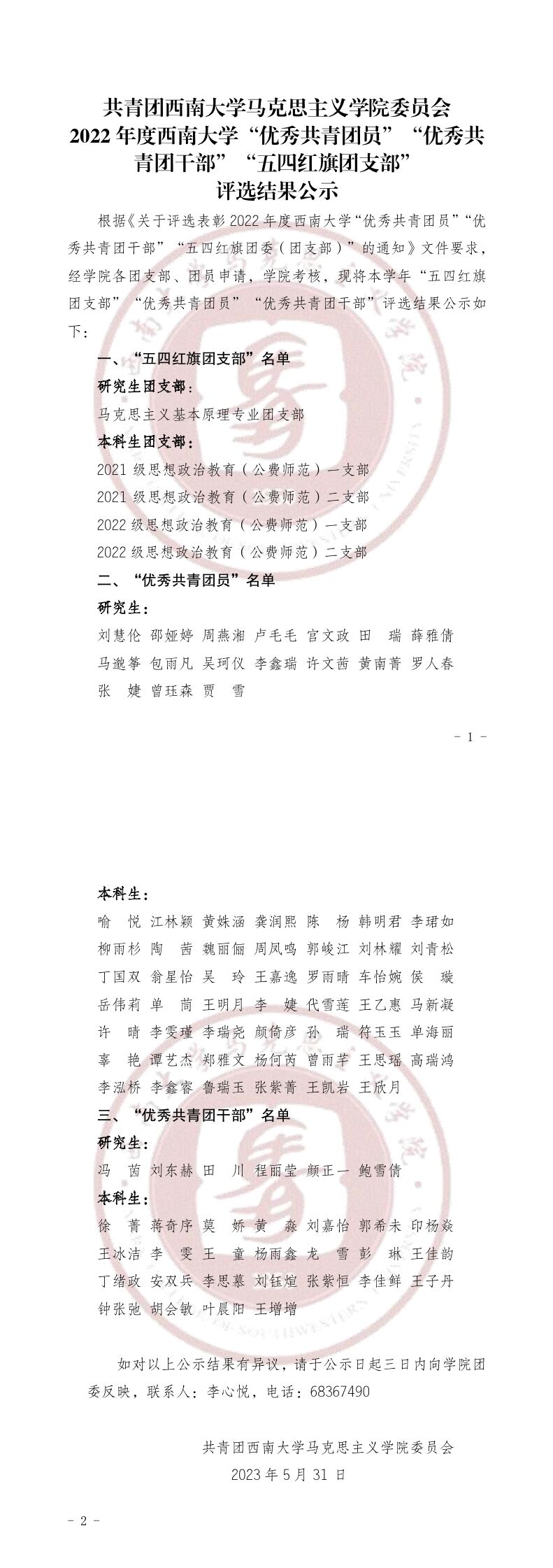共青团西南大学365英国上市集团委员会2022年度西南大学“优秀共青团员”“优秀共青团干部”“五四红旗团支部”评选结果公示