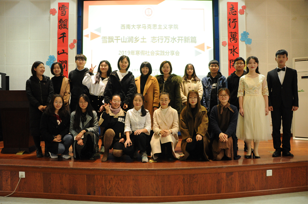 为给马院学子提供一个分享寒假社会实践的经验交流的平台,让同学们领悟更多实践方面的知识,学院特于3月22日下午3点举办了“雪飘千山润乡土,志行万水开新篇”2019年寒假社会实践分享会。学院党委副书记曾艳老师、团委书记李心悦老师、2017级辅导员王珏老师、2017级实习辅导员李康老师、2018级实习辅导员杜星老师和各年级实习辅导员、各兄弟学院社会实践部部长以及本科17、18级部分同学参与了此次分享会。