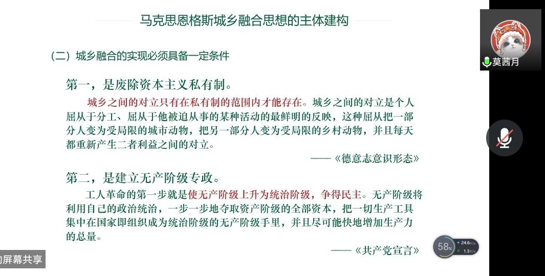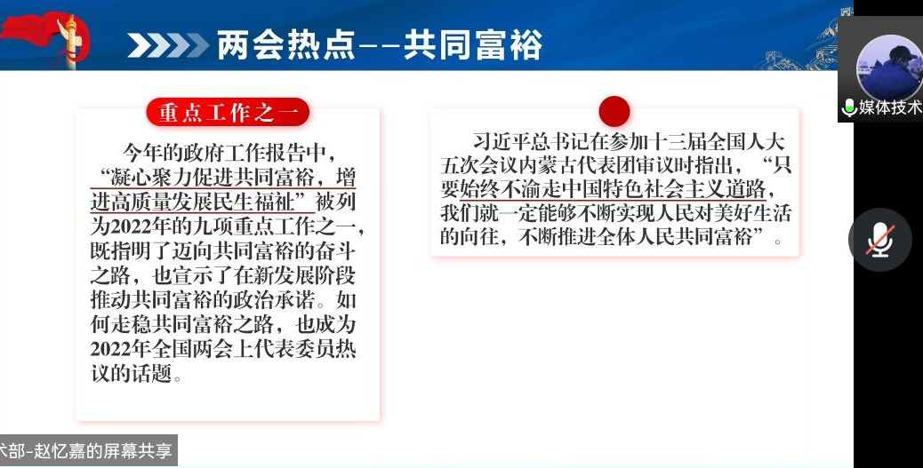 热点分享环节,双方各派出代表作主题分享。莫茜月同学以“城乡融合”为切口,从理论来源、主体建构、中国化实践对马恩城乡融合思想作深入阐释,做到热点与理论结合;吕强同学以乡村振兴等热点话题为线索,以个人的社会实践为实例展现民生常态,提出新时代青年应重任在肩,奋进有为;唐萌同学从“民生”入手,通过放假、就业、打击拐卖犯罪、网络暴力、生育、教育六大民生关键词对相关建议进行全面剖析;赵忆嘉同学聚焦“共同富裕”,结合《政府工作报告》,对“共同富裕”的家底进行经济、创新、生态文明等多方面分析,提出青年应做共同富裕的参与者、实践者、推动者。