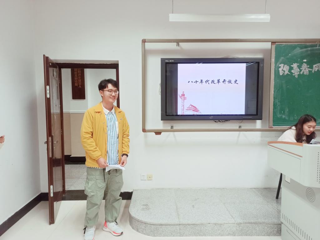 在第二环节“博物馆之旅”中,学研部的三名团员化身博物馆讲解员,分别对改革开放不同时期的发展变化进行生动讲述。在《改革开放1980》展厅中,王府魁同学向我们讲述了春天的故事:从蛇口工业区的动工,到五个经济特区的建立;从结婚四大件“三转一响”,到酒席上的大白兔奶糖,这一个个重要的历史时刻,一件件物品,让团员们深刻体会到,改革的春风,让人们的生活越来越好,让我国的经济走向繁荣;在《改革开放的九十年代》展厅中,赵文琪同学向我们介绍了二十世纪九十年代浦东的改革与发展:1990年,“浦东大开发”启程;1990年底,股票正式开始交易,将以市场化的方式利用我们的资金发展经济;1992年的南方谈话,让中国的发展走向开放吸收和改革创新;在《21世纪改革开放史》展厅中,倪莎同学从经济、交通两方面为大家展现新世纪上海改革开放的种种成果:上海自由贸易区助力中国经济体制改革和市场进一步开放;轨道交通的完善将浦东与浦西紧密联系在一起,共同进步,发展。在讲解员们的精彩讲述和与团员们的互动中,团员们身临其境,与历史对话,对改革开放四十年来的发展变革有了更清晰的认识,更深刻的体会。