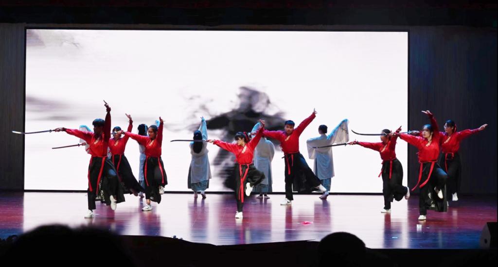 青春洋溢的音乐声响起,《我们都是追梦人》登上了舞台。台上的团员们随着音乐的节拍欢快地跳着,台下的观众们挥舞着手中的荧光棒,全场气氛热烈。节目最后,全体小宣人们面向着党旗,党旗飘飘,灯光闪闪,一颗又一颗赤诚的爱党心传下舞台,传向远方……