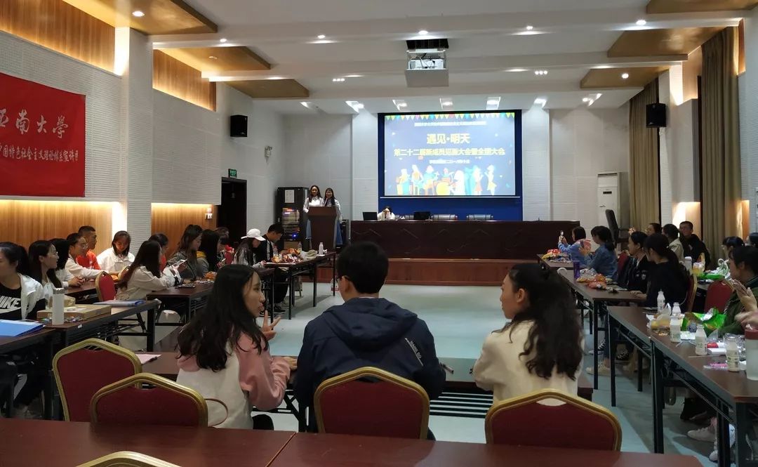 “湖南,重庆,山东,四川,新疆……”,“张家界,大足石刻,海鲜……”办公室,学研部,团学活动部,青马微声运营中心,宣讲部以及培训部六个部门的萌新们依次上台,或羞涩,或腼腆,或调皮,或热情……不同风格的自我介绍都用昂扬向上的姿态展现着新一代小宣人的青春活力。这次大会的另一部分主角们,也就是宣讲团的师兄师姐们用他们的方式表达了对萌新们的欢迎。主席团师兄师姐也都上台为亲爱的师弟师妹们寄语,侯瑜师姐“感谢,祝贺,期望”真挚的话语,高家毫师兄“很乖,很喜欢”直白而走心的告白……让新成员们感受到了学生宣讲团的温暖,和谐与团结。