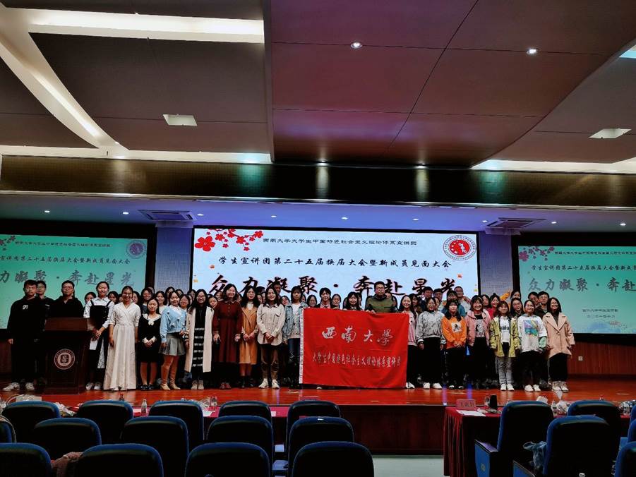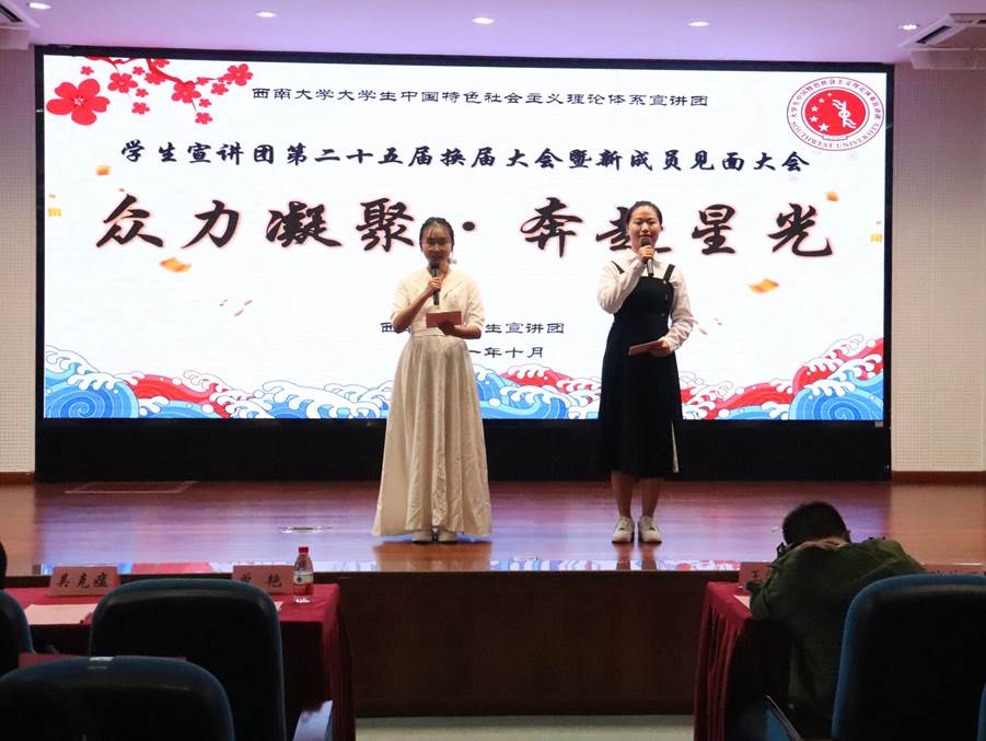 为促进团内家文化建设,西南大学大学生中国特色社会主义理论体系宣讲团(以下简称“学生宣讲团”)于2021年10月22日(星期五)16:00,在365英国上市集团505报告厅召开“众力凝聚·奔赴星光”第二十五届换届大会暨新成员见面大会。参与此次大会的有学生宣讲团指导老师曾艳老师和吴克瘟老师,学生宣讲团第二十四届、第二十五届全体团员以及嘉宾王傲轩、陈佳丽、彭霄烜。