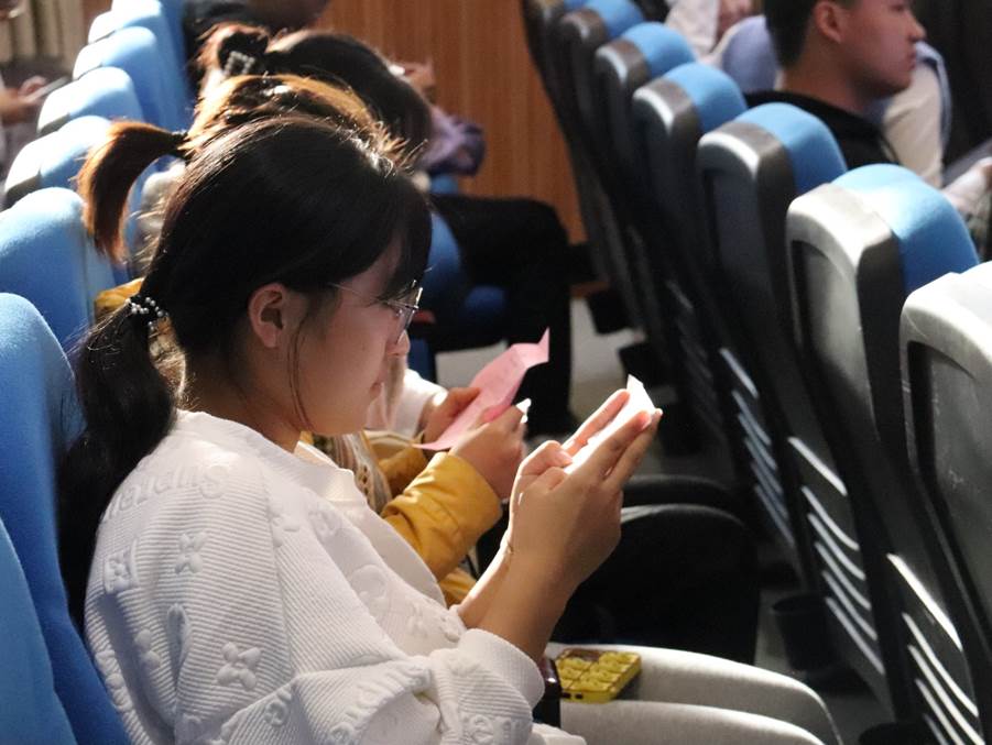 在薪火相传环节,第二十四届全体团员为新团员们准备了写有温馨寄语的折纸,并一同观看了上一届团员制作的祝福视频,拉近了各届小宣人之间的距离,加深了新任小宣人对学生宣讲团的归属感。