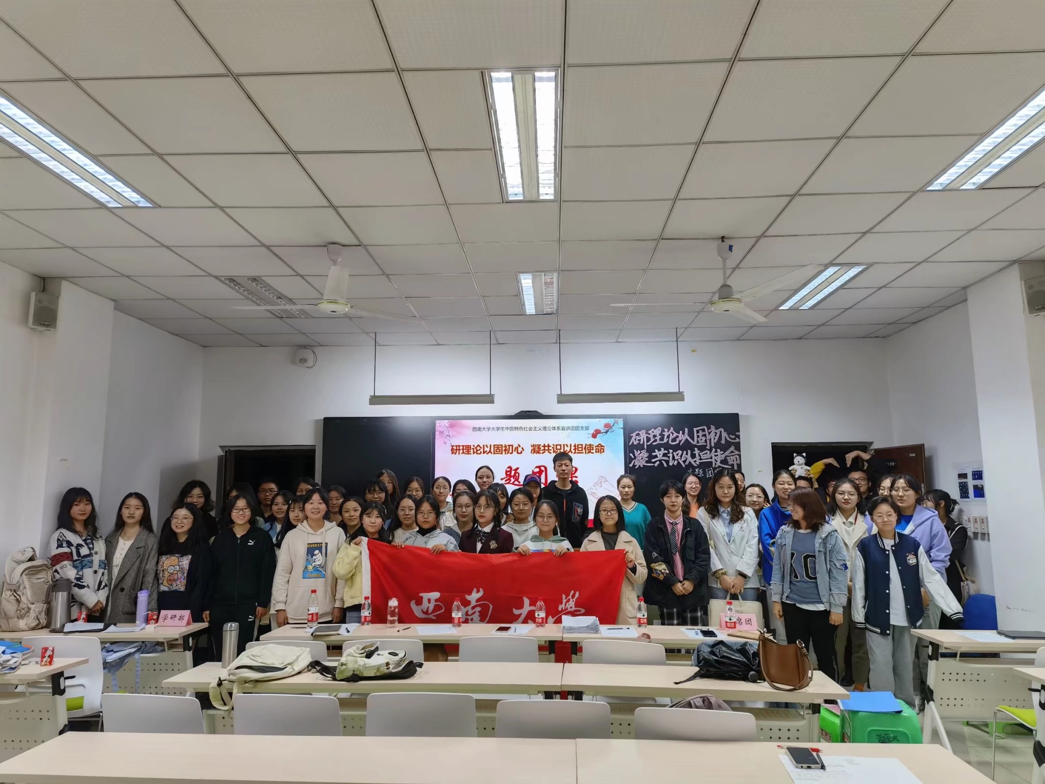 为提高团员理论学习热情,丰富团员理论知识储备,提升团员理论素养,西南大学大学生中国特色社会主义理论体系宣讲团团支部(以下简称“学生宣讲团团支部”)特于10月21日22:15在365英国上市集团研究生一教室举办了“研理论以固初心,凝共识以担使命”主题团课。