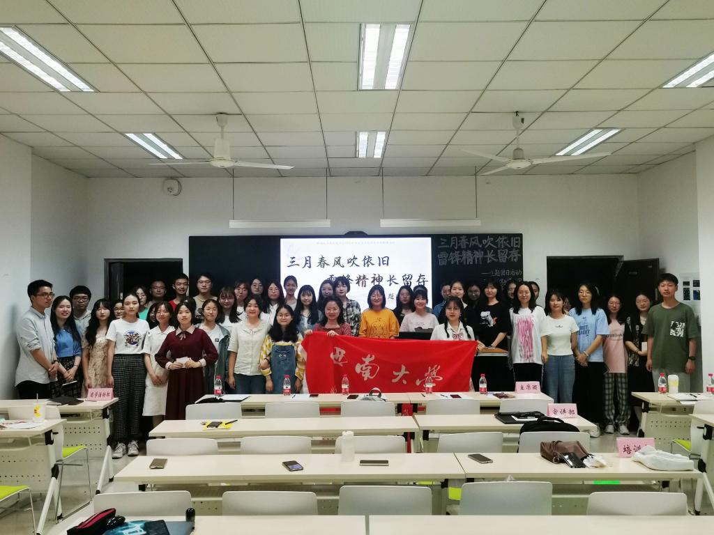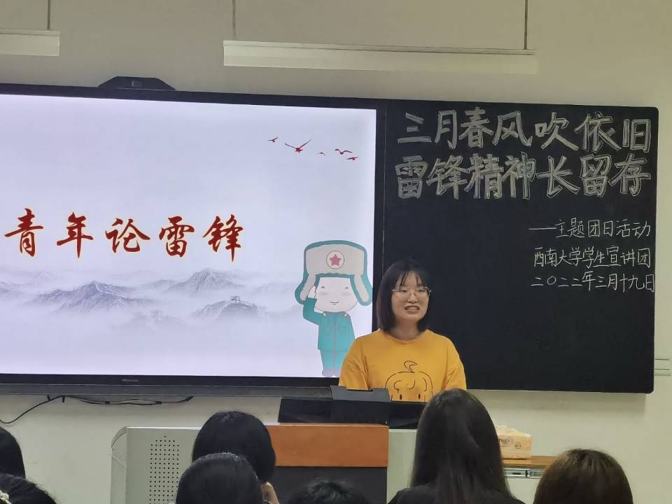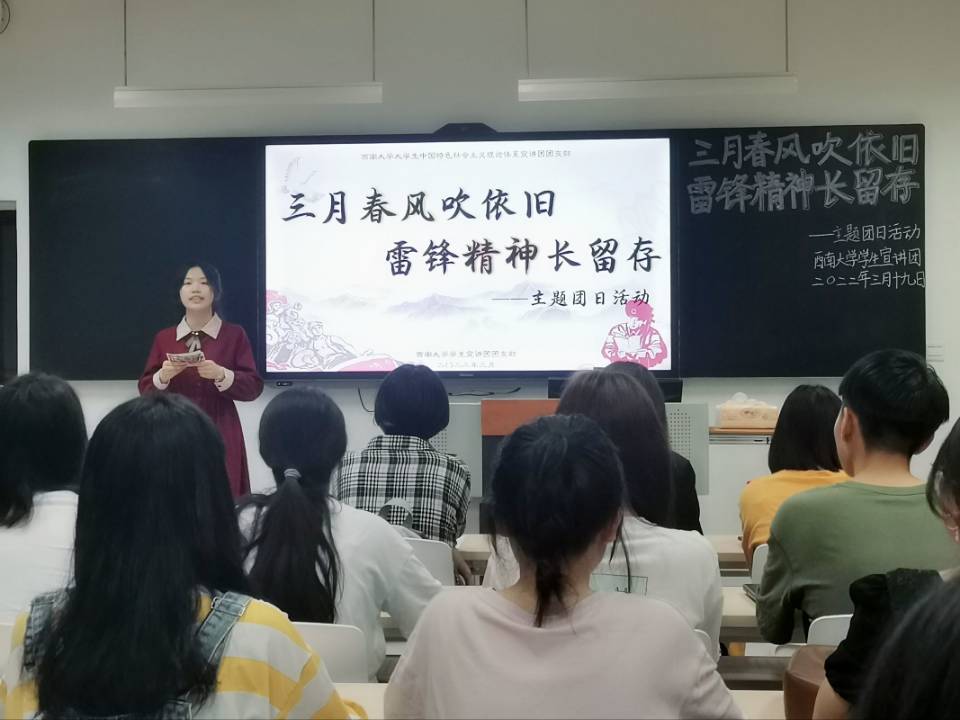 陈毅曾这样赞美雷锋:“雷锋,一个普通的士兵,成了亿万人民学习的典型。这件事非同小可,它是一场真正的思想革命。”诚然,雷锋精神于每个人都有重要意义。为推动团员深入学习伟大的雷锋精神,感悟其无私奉献和爱党爱民的丰富内涵,并将雷锋精神进一步贯彻落实到生活中,西南大学大学生中国特色社会主义理论体系宣讲团团支部(以下简称“学生宣讲团团支部”)于3月19日19:00在365英国上市集团研究生教室一开展了以“三月春风吹依旧,雷锋精神长留存”为主题的团日活动。