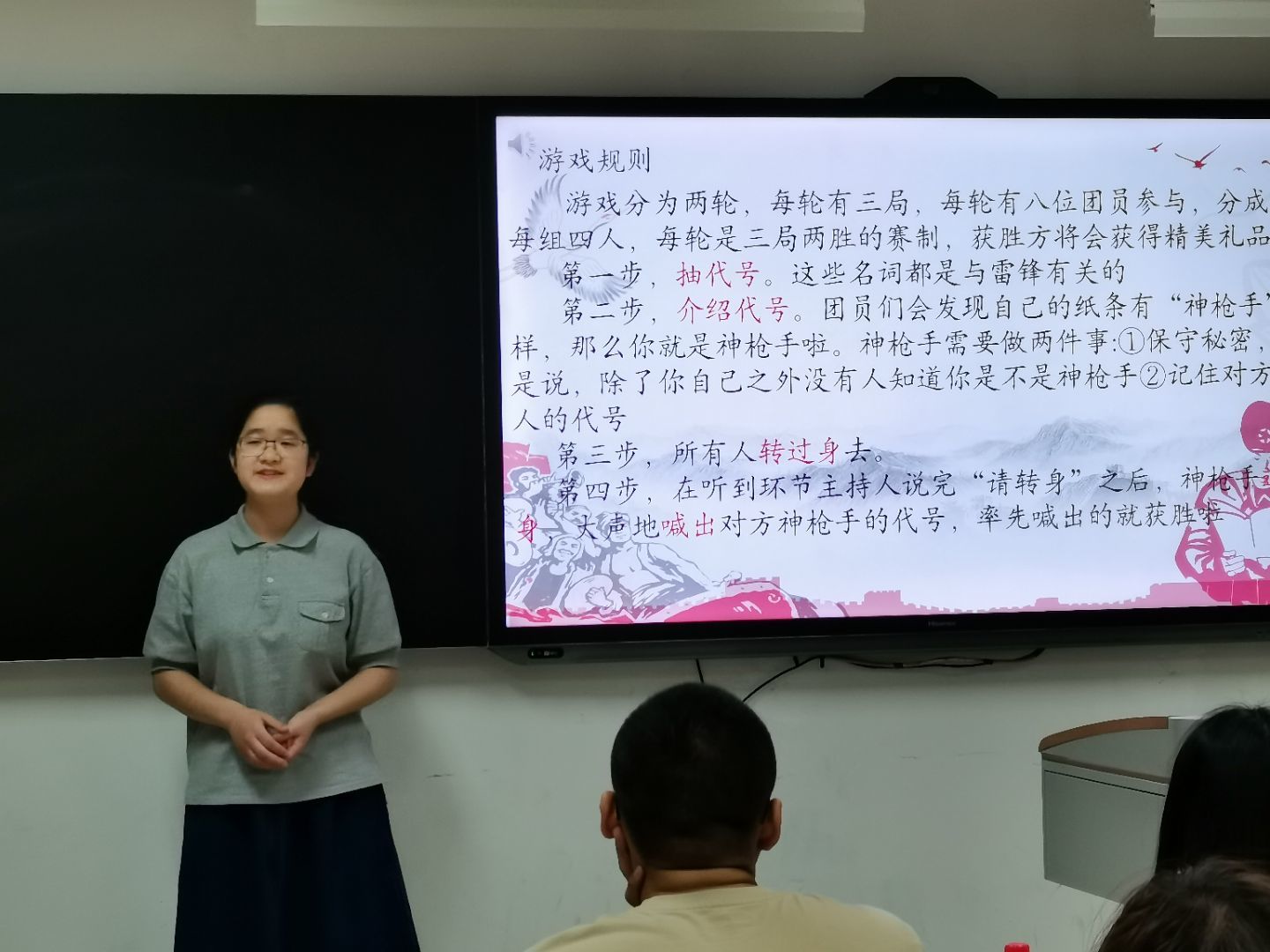 在欢乐的音乐声中,团员们迎来了“挑战神枪手”的游戏环节。在团员吴宇航的组织下,大家在轻松有趣的游戏中记忆雷锋的关键词,加深了对雷锋精神丰富内涵的理解。
