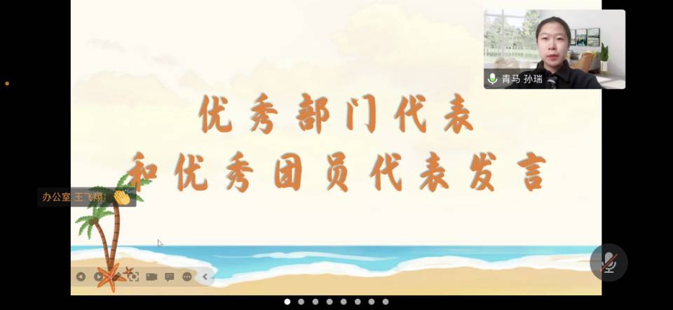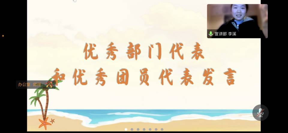 接下来的优秀团员和优秀部门表彰环节将总结大会推向高潮。主持人公布优秀团员及优秀部门名单,恭喜办公室邱祥、青马微声运营中心唐雯婕、团学活动部钟若楠、学研部刘昕诺、宣讲部李溪、培训部黄诗睿6位团员获得“优秀团员”称号,恭喜宣讲部和青马微声运营中心获得“优秀部门”荣誉。随后优秀部门代表青马微声运营中心孙瑞以及优秀团员代表宣讲部李溪发表了感言。