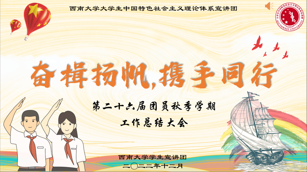 寒来暑往,光阴似箭,西南大学大学生中国特色社会主义理论体系宣讲团(以下简称“学生宣讲团”)2022-2023年度秋季学期学生工作现已圆满完成。12171500-1700,学生宣讲团于腾讯会议线上召开“奋楫扬帆·携手同行”第二十六届团员秋季学期总结大会。学生宣讲团第二十六届全体团员参与了此次总结大会。