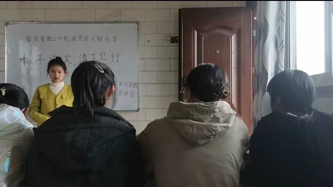 2月13日,李春芝同学在云南省大理州南涧县优学教育培训学校面向当地中学生进行宣讲。她通过讲述近五年来我们党反腐倡廉、打虎拍蝇的实际行动,让同学们清楚的认识到从严治党是烧旺党内政治生活的大熔炉,必须筑牢从严治党的政治根基。