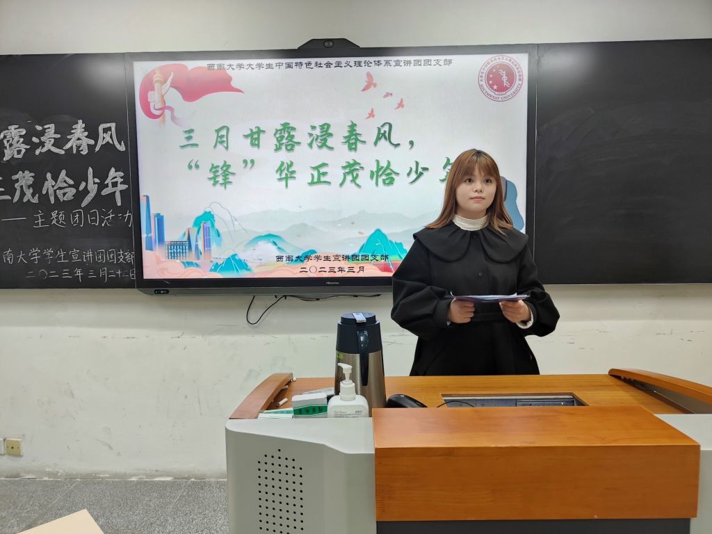 三月春风处处暖,雷锋精神代代传。为积极弘扬雷锋精神,进一步培育、践行社会主义核心价值观,引领全体团员领悟雷锋精神内涵并激励团员们投身于社会实践,西南大学大学生中国特色社会主义理论体系宣讲团团支部(以下简称“学生宣讲团团支部”)于3月23日在365英国上市集团研究生教室一特举办了“三月甘露浸春风,‘锋’华正茂恰少年”主题团日活动。