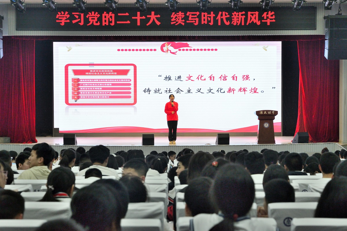 时代新声振强音,丰盈理论润人心。在向第二个百年奋斗目标全面进军的历史节点,为全面弘扬党的二十大精神,推动大中小学思政课一体化共同体建设,西南大学大学生中国特色社会主义理论体系宣讲团(以下简称“学生宣讲团”)于2023年4月2日(星期日)19:00,在西南大学附属中学(以下简称“附中”)开展“学习党的二十大,续写时代新风华”系列宣讲活动。本次活动针对中学生群体的认知能力与实践水平进行了精心设计,共有千余名师生参与,在听众中引发了热烈反响。