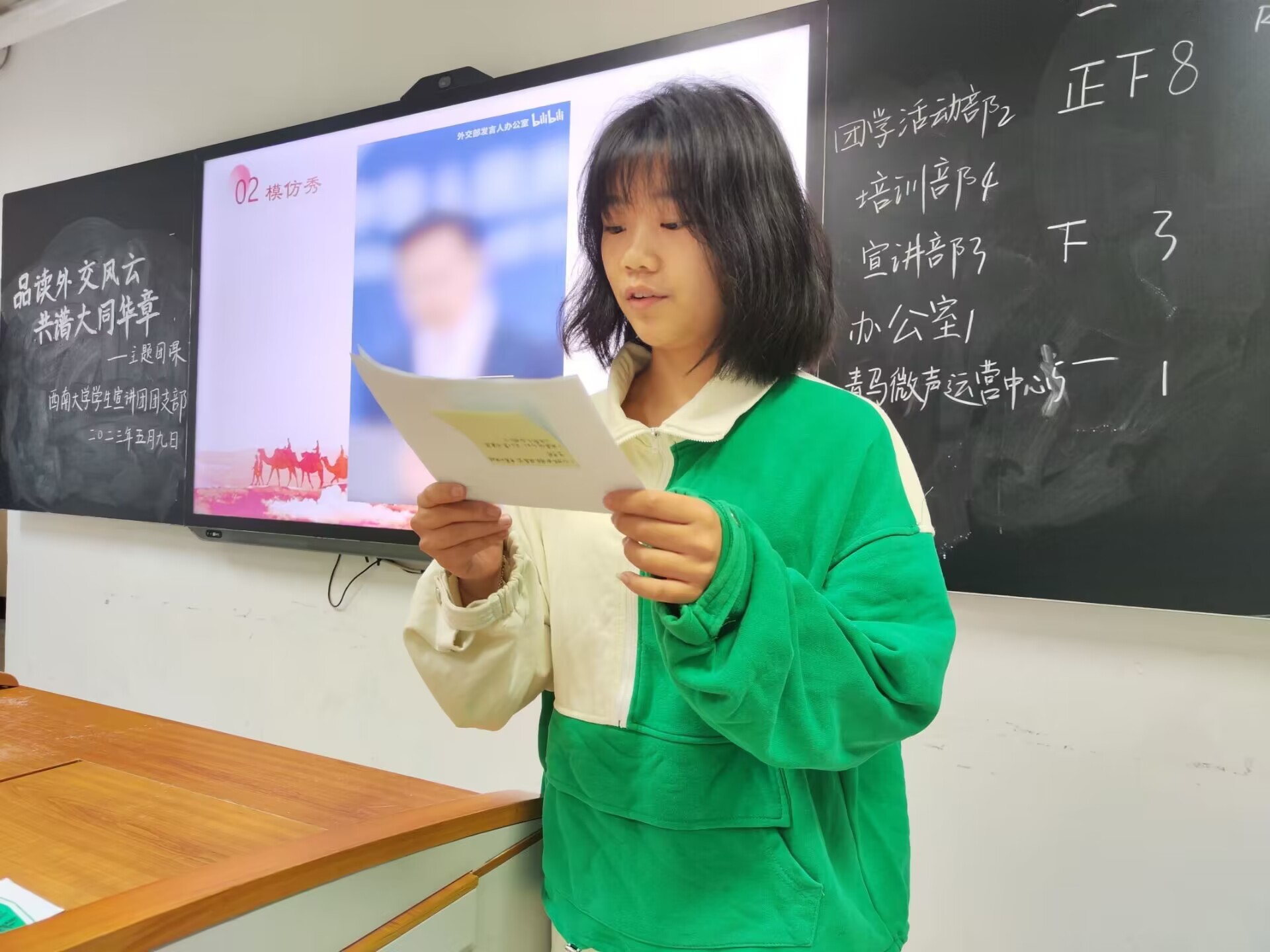 初步考核,锚点定位。在所有团员完成入营培训后,本环节采用积分制淘汰赛对前一环节的外交学习进行考核。考核官高菲设置形式多样的考题。团员们积极抢答,充分输出所学的外交知识。本环节的考核方式除了知识竞答,还有模仿秀。各部门按照PPT的抽签顺序派出代表对我国外交官的精彩发言片段进行模仿,让团员们在铿锵有力的“金句”中充分体会中国外交不卑不亢又泰然自若的风采,现场氛围其乐融融,“未来外交官”们已初露头角。在两轮模仿秀结束后,负责人在黑板上对各部门得分进行公示,团学活动部、宣讲部、青马微声运营中心积分前三,顺利成为实习外交官,办公室、培训部转型成为实习记者。