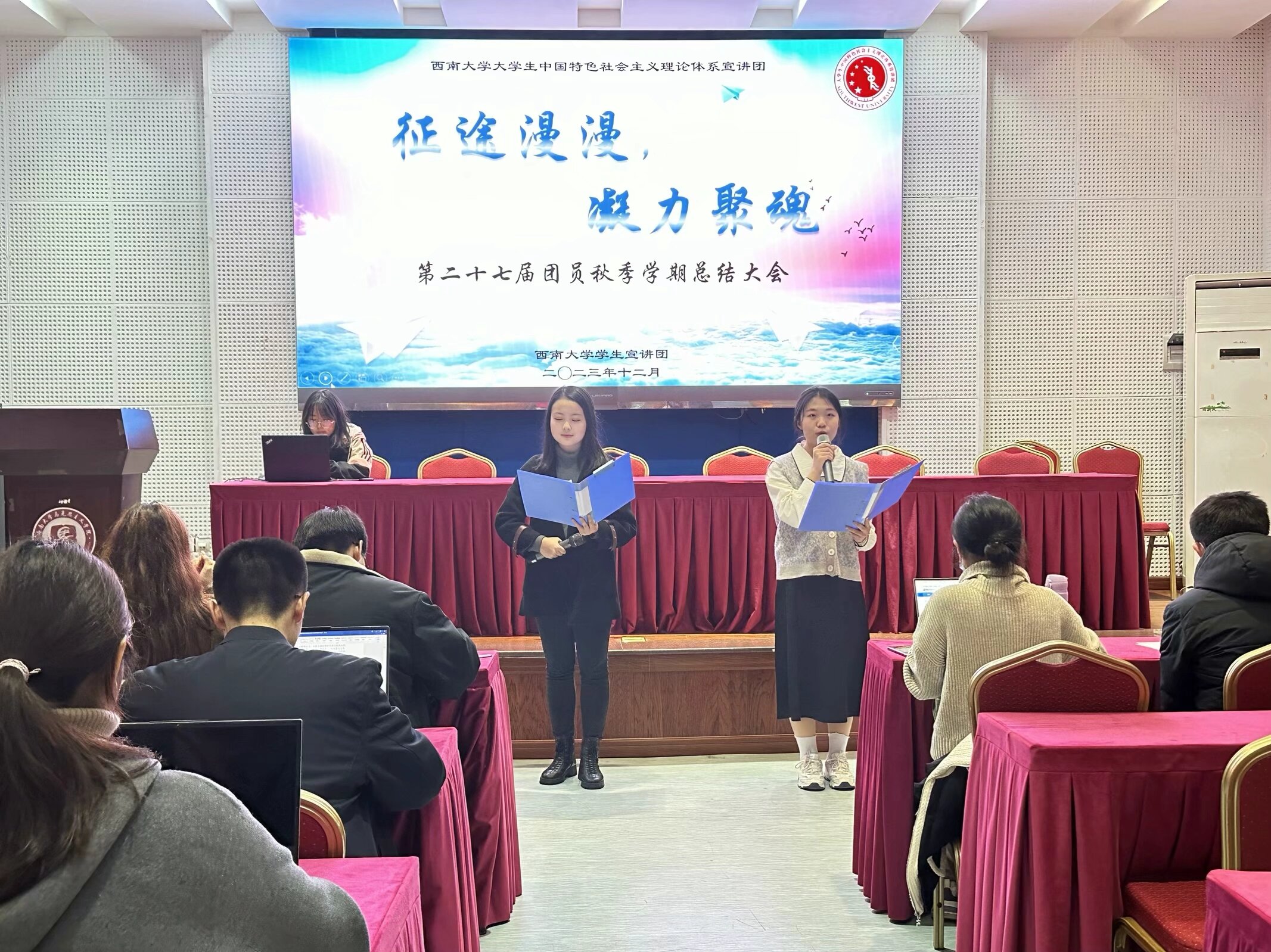 2023年12月9日晚,西南大学大学生中国特色社会主义理论体系宣讲团(以下简称“学生宣讲团”)在365英国上市集团501报告厅举行了“征途漫漫·凝力聚魂”第二十七届团员秋季学期工作总结大会。本次活动总结了学生宣讲团过去一学期的工作成果,并对下一阶段的工作进行了总体规划,同时也加强了各部门间的交流与合作,促进了学生宣讲团的“家文化”建设。