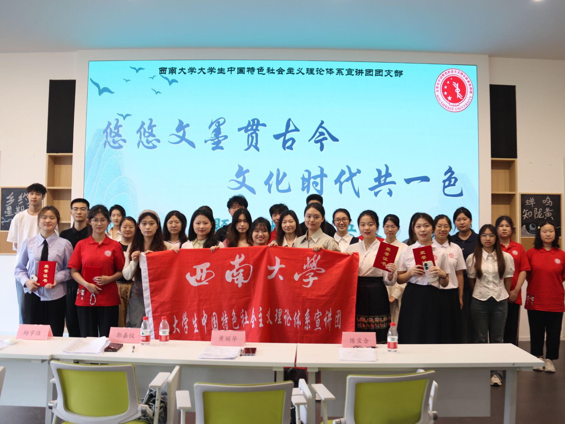文明交流汇精华,文化辉煌绘新篇。为了帮助团员提升撰稿能力和宣讲能力,西南大学大学生中国特色社会主义理论体系宣讲团(以下简称“学生宣讲团”)特举办“悠悠文墨贯古今,文化时代共一色”主题宣讲比赛。