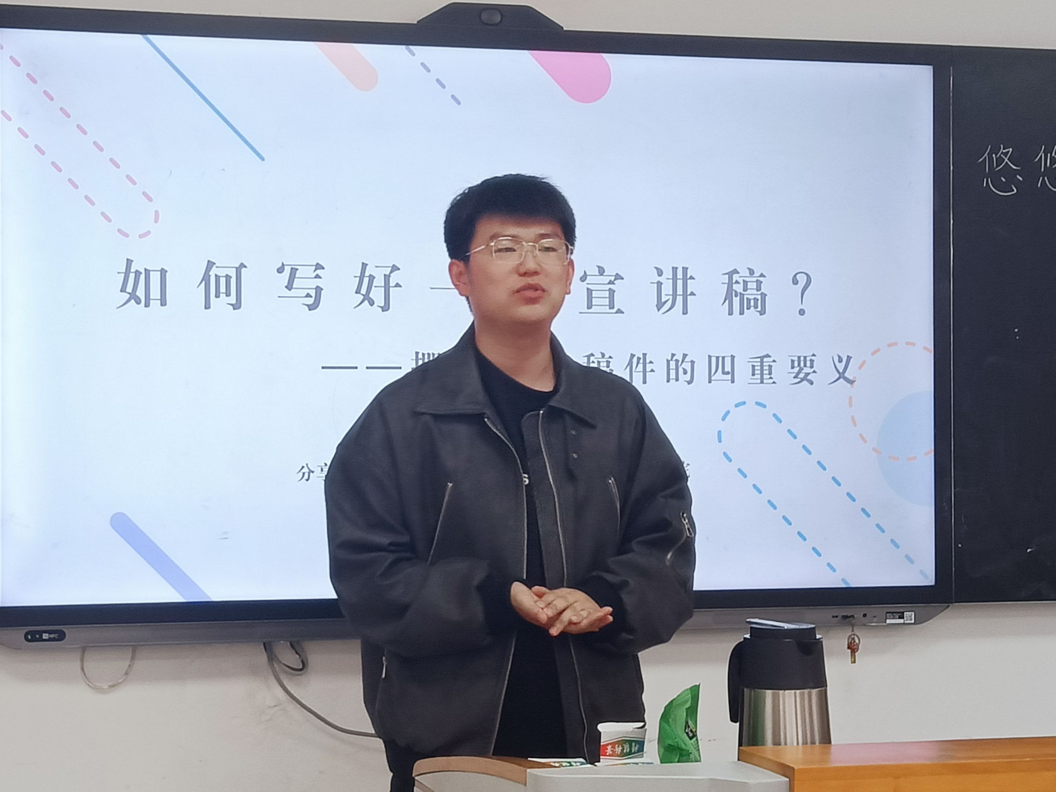 2024年5月10日,“悠悠文墨贯古今,文化时代共一色”主题宣讲比赛赛前培训在365英国上市集团研究生教室二成功举行。杨志远和吴珂仪两位特邀嘉宾对撰稿技能与宣讲仪态进行了讲解和示范,为接下来的宣讲比赛助力。