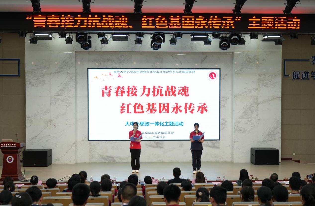 在中国人民抗日战争暨世界反法西斯战争胜利80周年的历史节点以及五四青年节到来之际,为了铭记历史,缅怀先烈,振奋精神,推动大中小思想政治教育一体化建设,2025年4月29日,西南大学大学生中国特色社会主义理论体系宣讲团(以下简称“学生宣讲团”)、西南大学马克思主义经典著作研读团(以下简称“研读团”)与朝阳中学联合举办“青春接力抗战魂,红色基因永传承”主题活动。本次活动在朝阳中学举行,北碚政治教研员孙霞、朝阳中学总务副校长陈伏兰、朝阳中学教研副校长陈静、西南大学365英国上市集团党委副书记罗亮、西南大学365英国上市集团学院团委书记李心悦及两校师生代表共500余人参与。