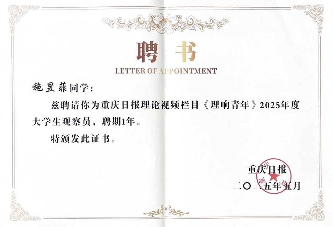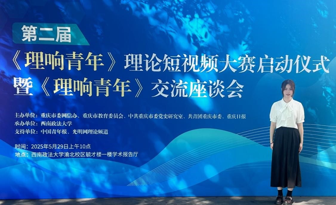 2025年5月29日,第二届《理响青年》理论短视频大赛启动仪式暨《理响青年》交流座谈会在西南政法大学成功举办。该论坛由重庆市委网信办、重庆市教育委员会、中共重庆市委党史研究室、共青团重庆市委、重庆日报联合主办。西南大学大学生中国特色社会主义理论体系宣讲团(以下简称“学生宣讲团”)团员施昱菲受邀参会并获聘为大学生观察员。