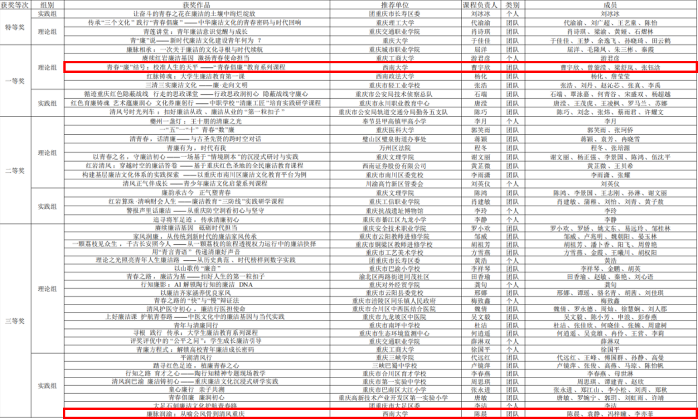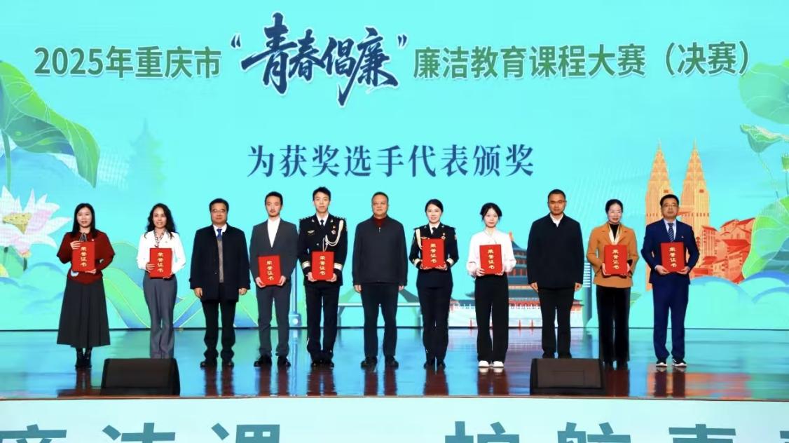 2025年12月2日,由市纪委监委机关、市委直属机关工委、市教委、市国资委、团市委主办,长寿区委、区政府承办的重庆市首届“青春倡廉”廉洁教育课程大赛决赛在长寿区科技文化中心圆满落幕。西南大学大学生中国特色社会主义理论体系宣讲团(以下简称学生宣讲团)表现亮眼,两支参赛队伍凭借优质课程设计与出色展示,从500余件参赛作品中脱颖而出,分别斩获理论教学类一等奖与实践研学类三等奖。