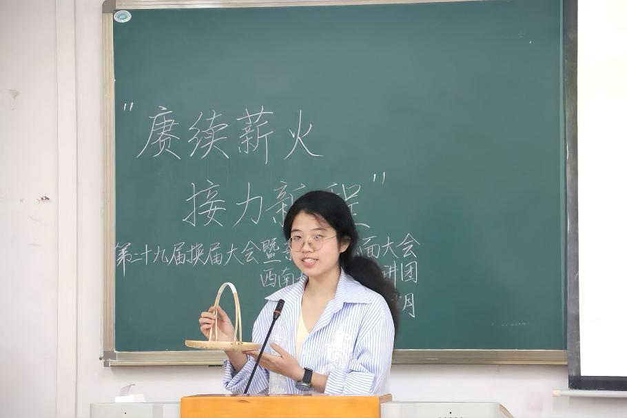 为促进团内家文化建设,西南大学大学生中国特色社会主义理论体系宣讲团(以下简称“学生宣讲团”)于2025年10月17日下午在第八教学楼405教室举办了“赓续薪火·接力新程”第二十九届换届大会暨新成员见面大会。参与此次大会的成员有学生宣讲团第二十八届部分团员、第二十九届全体团员以及来自学院学生组织的四位嘉宾。