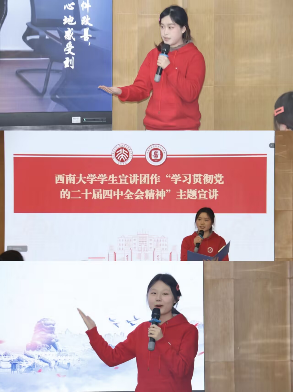 西南大学学生宣讲团团员施昱菲聚焦全会部署中的民生举措,结合现实案例解读政策温度;曹宇欣带领大家一起探讨数字技术赋能传统文化传承的创新路径。后续的快板舞表演更是以活泼新颖的形式传递党的二十届四中全会精神,将现场氛围推向高潮。