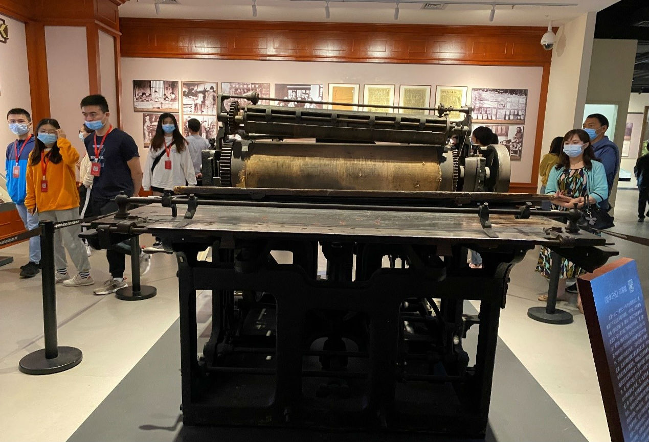 图3.讲解员讲解第一部分《共赴国难 抗日民族统一战线形成》 图4.国家一级文物《新华日报》印刷机