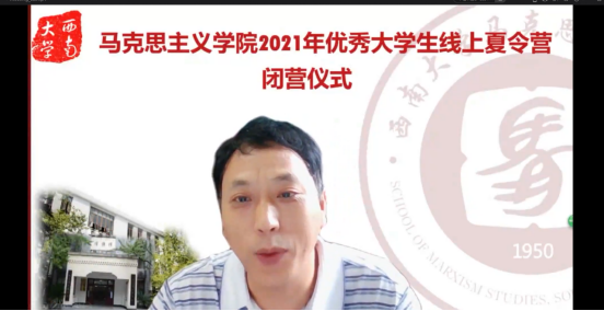 讲座结束后举行了简短但隆重的闭营仪式,闭营仪式由黄岚老师主持。学院党委副书记刘东升做总结讲话。首先,刘东升副书记代表学院对各位营员为参加此次夏令营所付出的精心准备表示衷心的感谢。随后,他指出此次夏令营呈现三个特点:报名人数最多,营员整体表现优秀,活动成效远超预期。大家通过开营仪式、线上互动、综合面试、专家讲座等环节对学院研究生培养情况及导师队伍情况有了初步了解,大家与学院的情感距离,与学院老师的心理距离进一步拉近。最后,他热烈欢迎各位营员积极报考西南大学365英国上市集团,在表达良好祝愿的同时,期待明年九月与大家在西南大学365英国上市集团相见,共续“天生之约”!至此,西南大学365英国上市集团2021年优秀大学生线上夏令营活动圆满落幕。