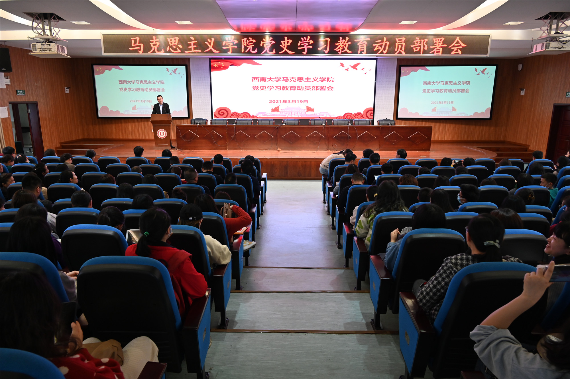 二是加强党史宣讲。学院充分发挥党史党建学科的人才优势,积极推荐和组织党史学习教育宣讲团,组建了专家教授、青年教师和大学生三级宣讲团,形成了体系完备、师生联动的宣讲模式。推荐黄蓉生、潘洵、白显良、吴艳东4位教授为重庆市委宣讲团成员,深入到重庆市级机关和高校宣讲。精锐出战,选派8名专家教授助力北碚区校地联合宣讲团,深入北碚区机关、企业开展宣讲。精心选派24位专家教授组建学校党史宣讲团,深入到学校各学院、各部门和校外企事业单位进行宣讲。“大学生宣讲团”创新宣讲形式,采用快板、情景演绎、隔空对话等形式,深入西南大学36个学院学生群体、中小学、乡村开展生动的党史故事传颂。“学生寝室党史故事会”“班级党史故事每日一讲”,学党史、讲党史蔚然成风。党史宣讲活动掀起热潮,得到新华社、人民网、光明网、中国教育新闻网、重庆日报、当代党员等媒体关注报道。