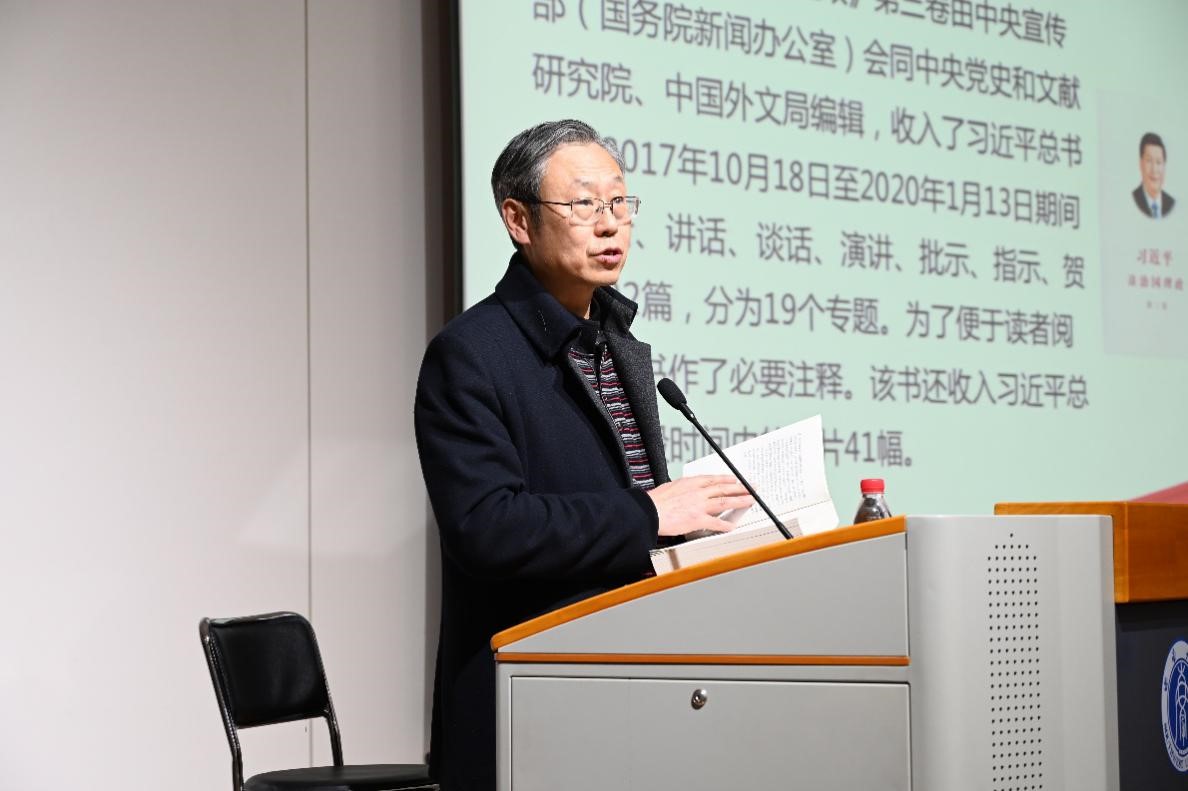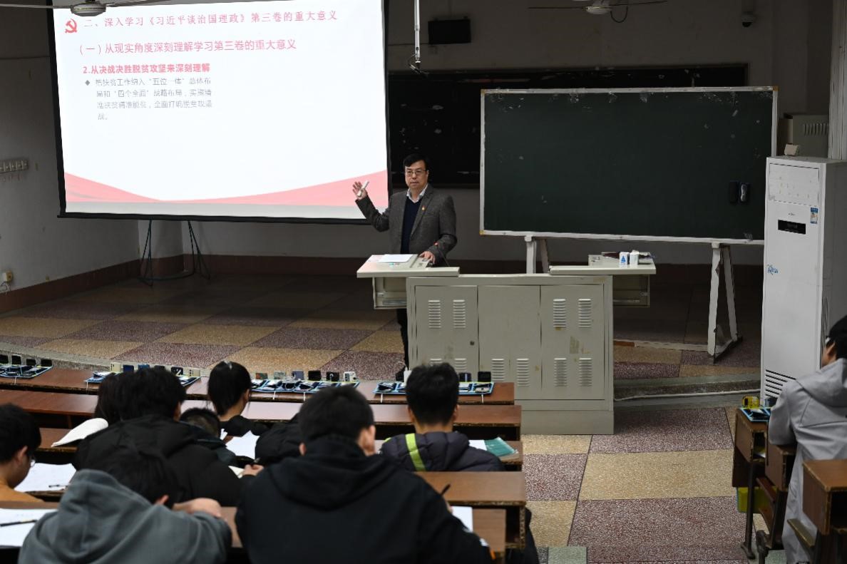 为深入学习贯彻习近平新时代中国特色社会主义思想特别是习近平总书记关于教育的重要论述,全面贯彻党的十九届五中全会精神,全面系统、及时跟进推动党的创新理论进教材、进课堂、进学生头脑。近期,学校党委书记李旭锋教授、校长张卫国教授等校领导纷纷走进课堂、走上讲台,以“深入学习《习近平谈治国理政》第三卷——贯彻落实习近平总书记关于教育的重要论述”为主题,为本科生讲授“形势与政策”课。