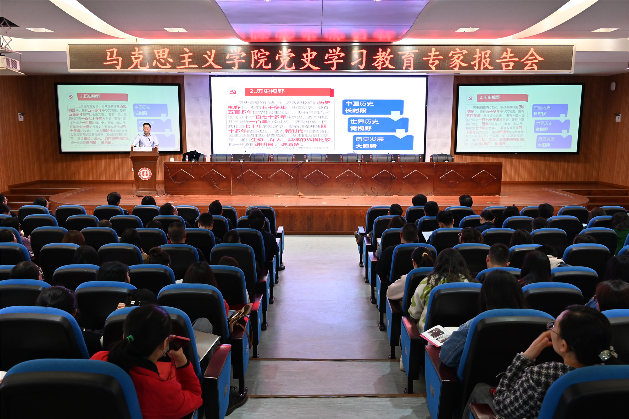 动员部署会后,学院党委邀请中共重庆市委党史研究室副主任周廷勇为全体党员作了党史学习教育专家报告第一讲:“学好‘教科书’,跳出‘周期率’——习近平《论中国共产党历史》解读”。讲座紧紧围绕习近平《论中国共产党历史》这个主题,聚焦学好“教科书”,跳出“周期率”这个主题,从不懈奋斗史、理论探索史、自身建设史三个方面进行了详细解读。讲座坚持大历史观,坚持正确的党史观,对广大党员师生深入理解习近平如何看待和用好中共党史,进而深入理解习近平新时代中国特色社会主义思想提供了重要参考,也为高标准高质量推进党史学习教育提供了有益借鉴。