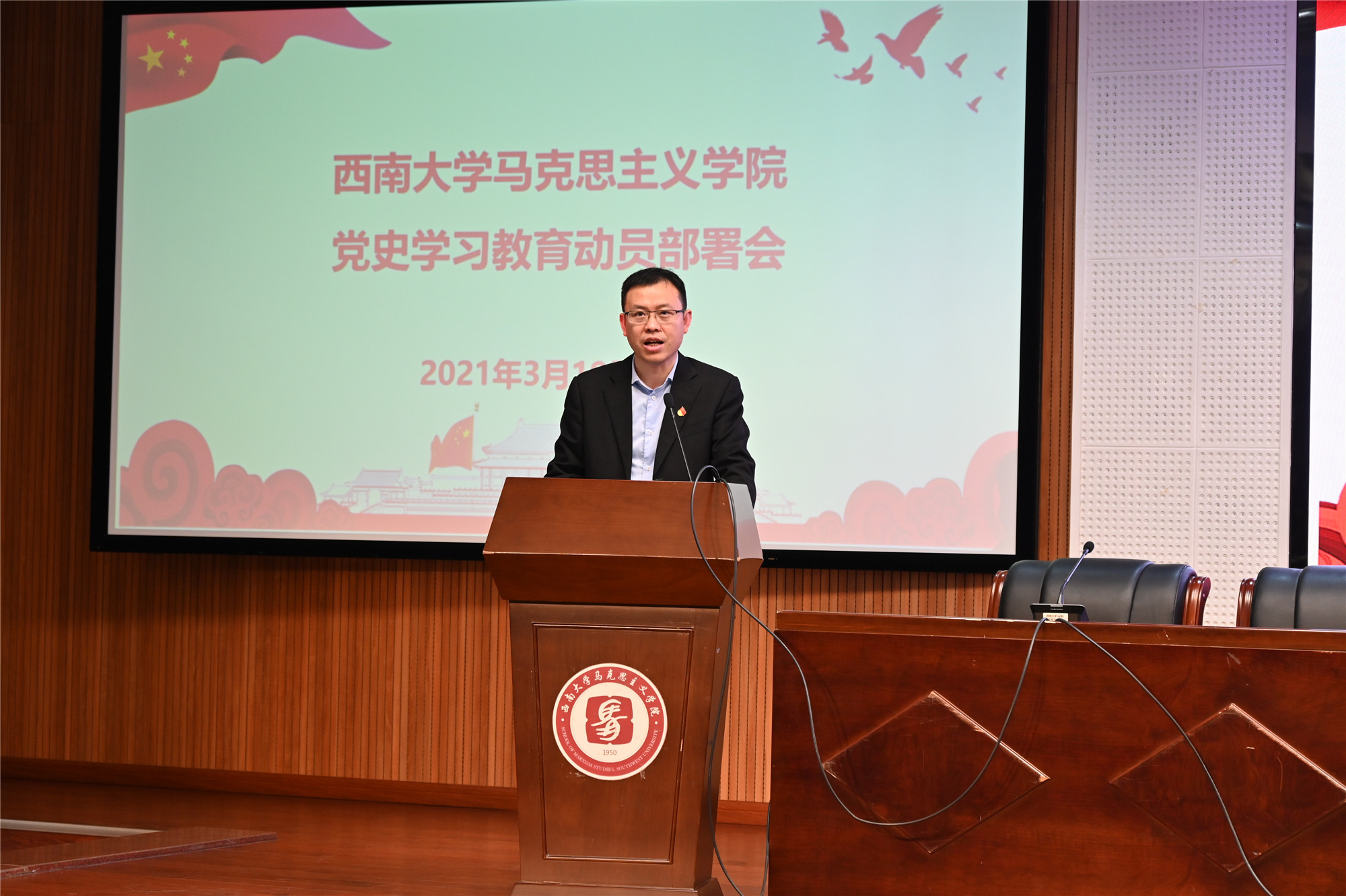 3月19日下午,学院召开党史学习教育动员部署会,学院全体师生党员参会,学院党委常务副书记廖晓衡作动员讲话。