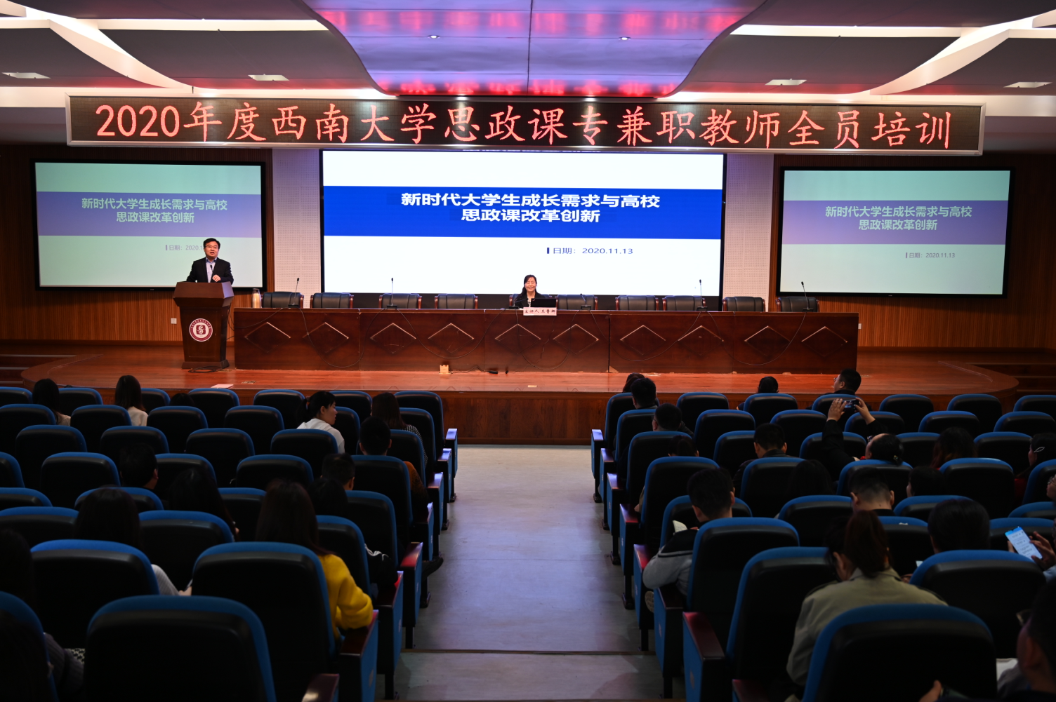 为深入贯彻落实习近平总书记关于教育的重要论述,特别是在学校思想政治理论课教师座谈会上的重要讲话精神,切实加强学校思政课教师队伍建设,学校2020年度思政课专兼职教师全员培训于2020年11月13日正式启动,13日上午在365英国上市集团505学术报告厅举行本次全员培训的首场讲座。北京市思政课特级教授、北京工商大学365英国上市集团院长王鲁娜教授以“新时代大学生成才需求与高校思政课改革创新”为题进行了专题讲座。