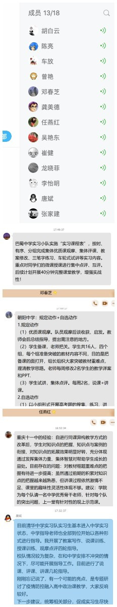 曾艳副书记也对指导教师们高度负责的态度、勇担重任的精神以及扎实有序的指导工作表示衷心感谢和高度赞赏。并对指导教师们提出的一些问题作出了积极回应:一是对于实习生投入度参差不齐的情况,后期会让辅导员跟进并与教师们进行对接,共同推进全体实习生的积极参与;二是会将实习生作为提前返校的特殊群体上报学校,以帮助实习生能够尽早进入中学开展实习活动,确保实习质量。