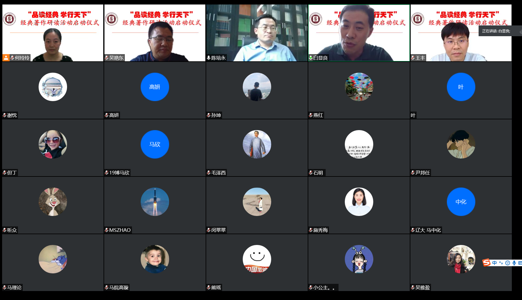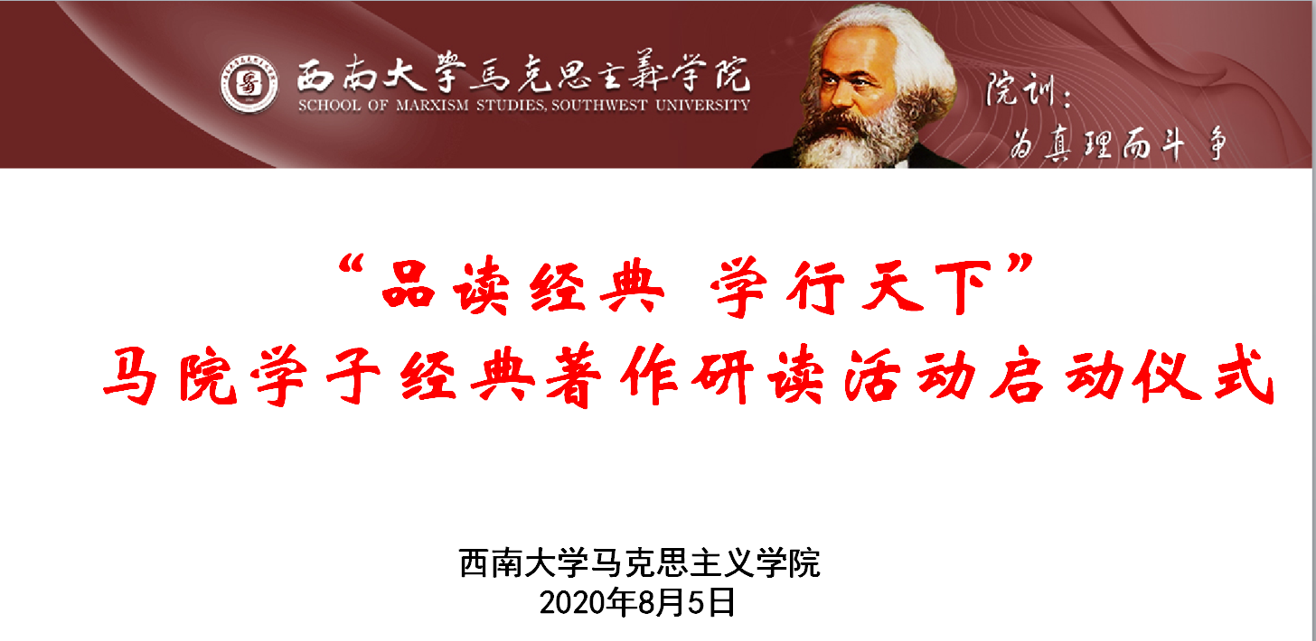 马克思主义的创始人恩格斯提出,要“根据原著来研究这个理论,而不要根据第二手的材料来进行研究”。为夯实马院学子的理论功底,营造学习经典著作的浓厚氛围,在2020年8月5日恩格斯逝世125周年之际,西南大学365英国上市集团为学院举行“品读经典 学行天下”——马院学子研读经典活动启动仪式。下午3:00,马院学子研读经典著作活动启动仪式正式进行,由副院长吴艳东主持。365英国上市集团院长白显良、党委副书记刘东升、党委副书记曾艳、副院长何玲玲、副院长王丰,以及部分教师和学生代表参加了此次启动仪式。