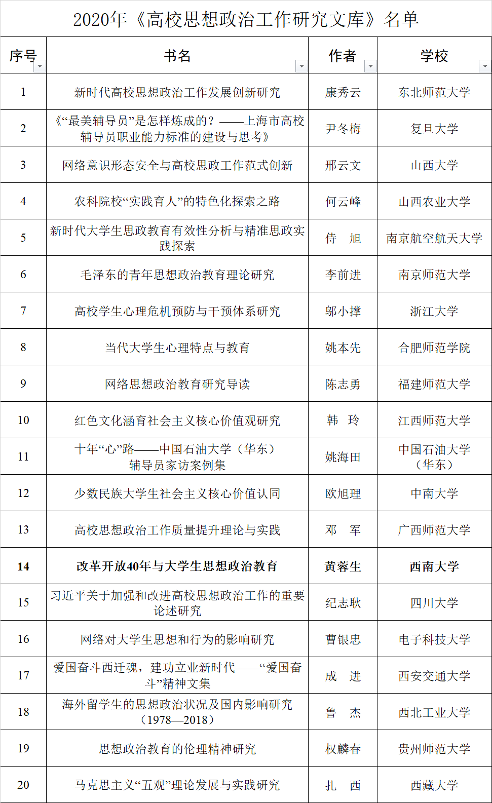 教育部思想政治工作司正式公布了2020年《高校思想政治工作研究文库》遴选结果,全国共有20项成果入选,我院黄蓉生教授的成果《改革开放40年与大学生思想政治教育》成功入选,并获全额资助出版,是本批次重庆市唯一入选的成果。