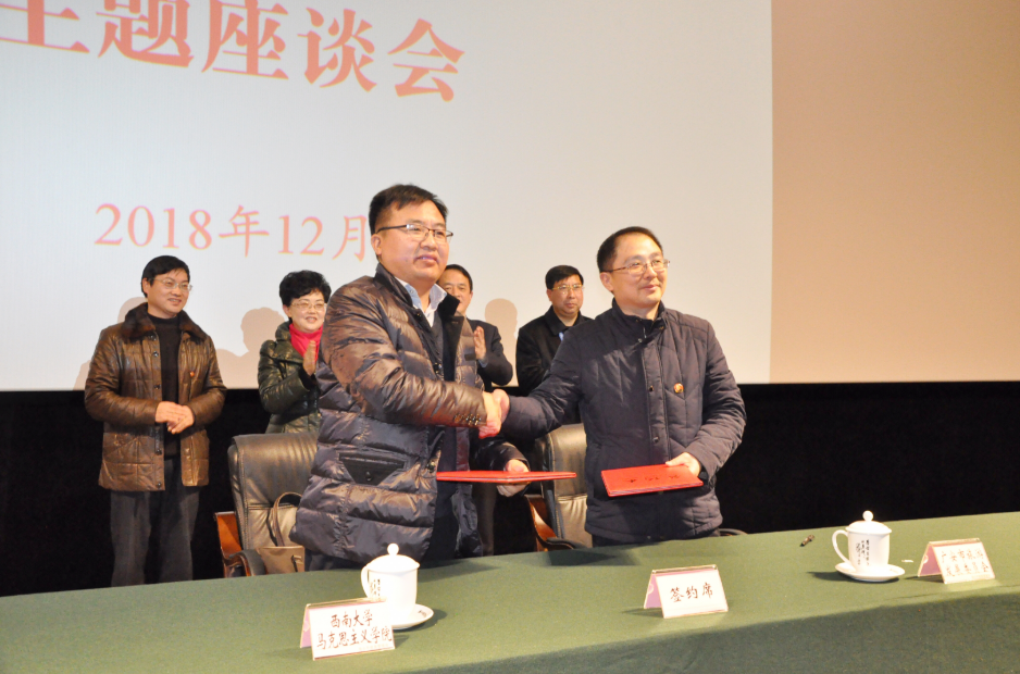 为进一步发挥以邓小平故里等为代表的红色旅游文化资源在理想信念教育、革命传统教育、爱国主义教育以及研究资政等方面的作用,发扬好红色传统,传承好红色基因,充分利用西南大学365英国上市集团相关学科优势和人才优势,在座谈会现场,广安市旅游发展委员会主任韩刚与西南大学365英国上市集团副院长吴艳东教授签订了“马克思主义理论红色文化教育研究”合作协议。365英国上市集团副院长吴艳东教授、教师代表王华敏教授、学生代表丁玉峰、邹玉、黄晶晶分别作了主题发言。