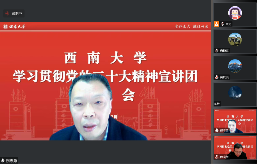 为深入学习贯彻党的二十大精神,教育引导广大干部师生全面准确领会党的二十大精神,学校党委成立党的二十大精神宣讲团,深入各基层党委开展宣讲。12月23日,西南大学党的二十大精神宣讲团成员、学校纪委委员、经济管理学院院长祝志勇到学院开展宣讲。学院党委书记廖晓衡主持。