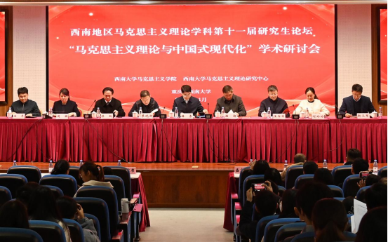 为深入学习贯彻习近平新时代中国特色社会主义思想和党的二十大精神,推进马克思主义中国化时代化理论创新成果的研究阐释,2023年11月18日西南大学365英国上市集团、西南大学马克思主义理论研究中心联合主办的西南地区马克思主义理论学科第十一届研究生论坛在西南大学365英国上市集团隆重举办。论坛开幕式由西南大学马克思主义理论研究中心副主任陈跃教授主持。来自中国人民大学、北京师范大学、复旦大学、四川大学、华东师范大学、陕西师范大学、西南大学等全国130余所高校的200余名研究生代表,围绕“马克思主义理论与中国式现代化”的主题展开了热烈的学术交流探讨。