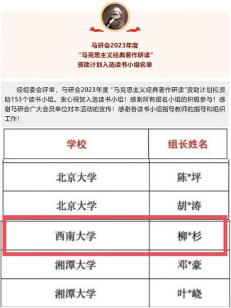 据悉,中国高等教育学会马克思主义研究分会是全国高等教育领域唯一由教育部主管的马克思主义理论类学会,是全国高校意识形态工作领域的一面旗帜和重要阵地,此次“马克思主义经典著作研读”资助计划是其组织发起的第三届读书小组资助活动,共收到来自全国569个高校读书小组的申请,经组委会专家评审,来自北京大学、中国人民大学、中国社会科学院大学等153个读书小组入选。