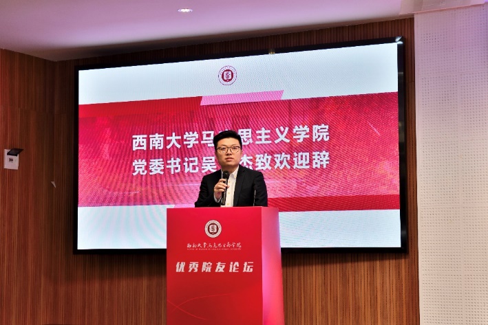 学院党委书记吴文杰在致辞中对优秀院友表示热烈欢迎,同时对学院发展历程做了简要介绍。经过数十年的不懈努力,学院各项事业发展已取得长足进步,先后入选省级、全国重点马院、全国党建工作标杆院系和国家级的人文社科重点研究平台。他期望在将来能有更多优秀院友回到学院,通过“优秀院友论坛”这一平台,推动促进学院广大同学与众多优秀院友进行面对面深入交流,更好发挥优秀院友模范引领示范作用。随后,全体与会师生代表观看了由罗洪铁老师制作的欢迎视频,共同回顾了优秀院友代表覃伯军的求学生涯和工作经历。