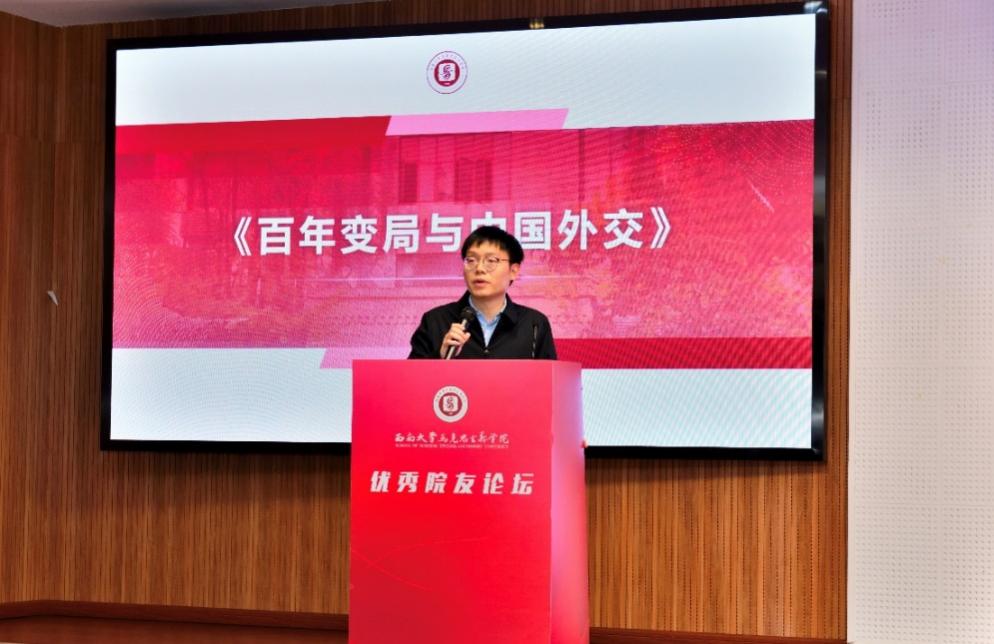 第二阶段为优秀院友访谈环节,覃伯军与学生代表亲切交谈,现场气氛温馨而热烈。他回忆了个人在西南大学本科期间就读时的学习经历,畅谈了从学生身份到外交官的转变契机和成长经历。接着,他对师弟师妹们有关“如何阅读经典著作”“如何选择和确立好个人发展方向”“如何完成从学生到工作中的身份转变”等问题,结合自己的求学和驻外工作经历进行了系统全面的回答。最后,他强调了阅读经典著作的重要性,总结了成为优秀人才所需的必备条件,从能力、心态和身体三个方面为师弟师妹们的职业生涯规划和个人成长提出了诚挚的建议,鼓励大家“做好准备”,为个人职业发展及人生成长积蓄力量。
